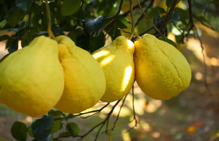 沙田柚(學(xué)名:Citrus maxima (Burm.) Merr. cv. Shatian Yu.)蕓香科、柑橘屬植物,喬木。嫩枝、葉背、花梗、花萼及子房均被柔毛,嫩葉通常暗紫紅色,嫩枝扁且有棱。葉質(zhì)頗厚,色濃綠,闊卵形或橢圓形。果梨形或葫蘆形,果頂略平坦,有明顯環(huán)圈及放射溝,蒂部狹窄而延長呈頸狀,果肉爽脆,味濃甜,但水分較少,種子頗多。果期10月下旬以后,屬中熟品種。 沙田柚因廣西容縣沙田村最先種植故稱做沙田柚。沙田柚不但營養(yǎng)價(jià)值高,而且還具有健胃、潤肺、補(bǔ)血、清腸、利便、消食、解酒毒等功效